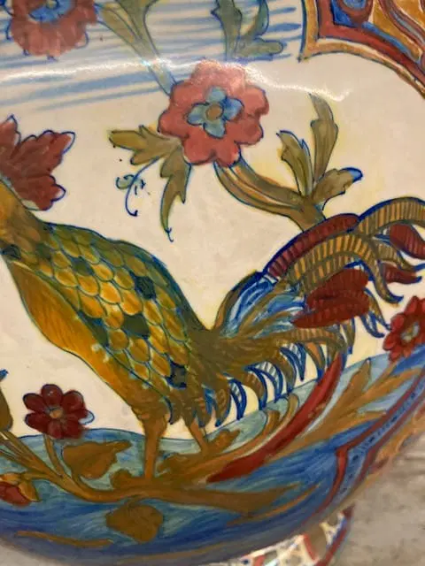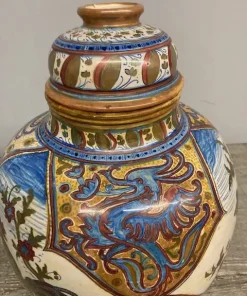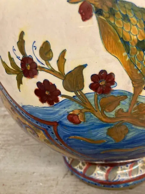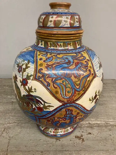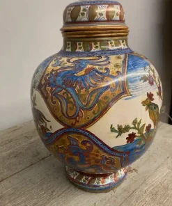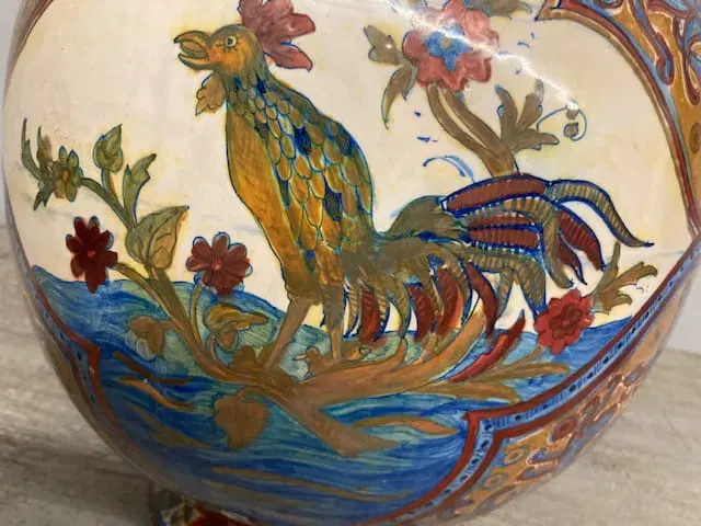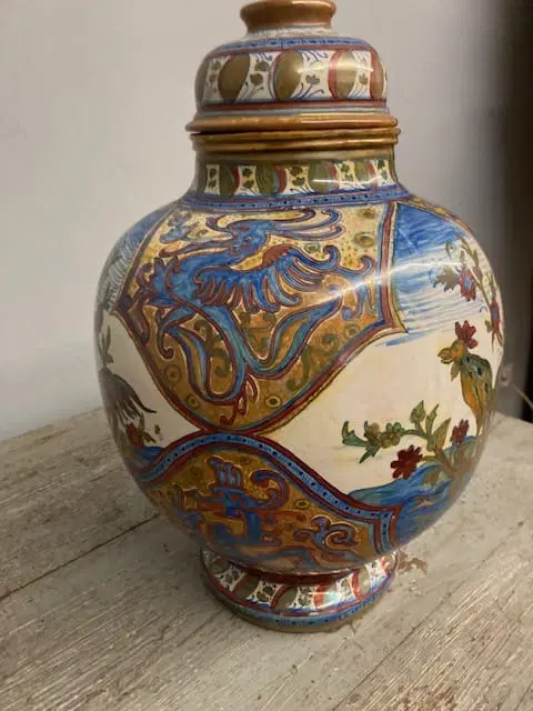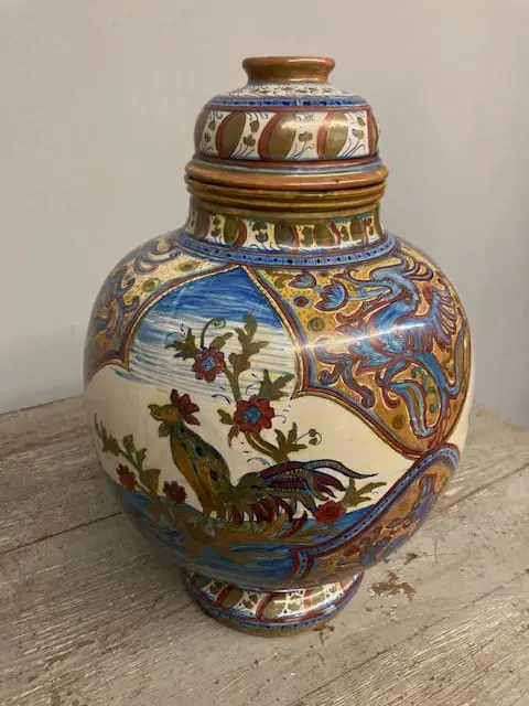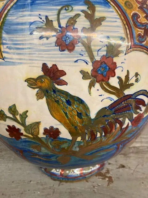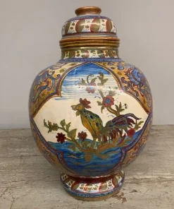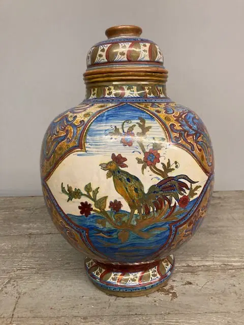 Antico grande vaso ,Potiche , realizzato a Lustro fornace prof . Alfredo Santarelli Gualdo Tadino in puro stile Liberty con Gallo Cedrone. Dimensioni importanti . Ottimo lo stato di conservazione. Ha il suo tappo . Marchiato AS alla base . Epoca 1920