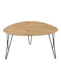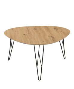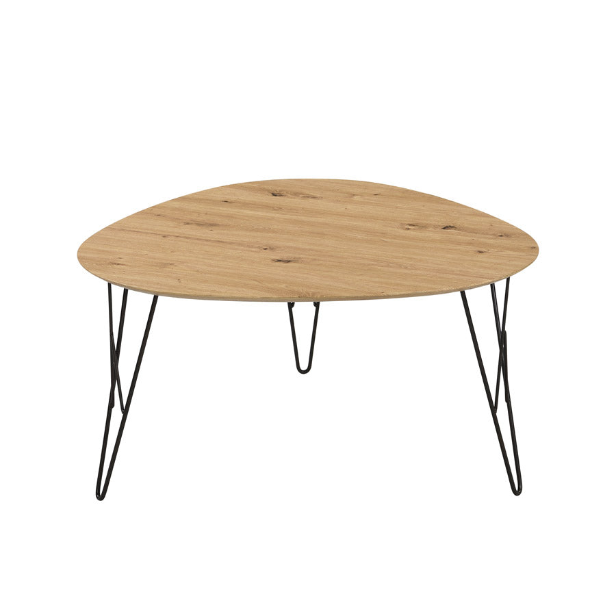 Tavolino da salotto ampio con piano dalla forma triangolare realizzato in legno finitura quercia accompagnato da 3 gambe in metallo colore nero. Un’idea perfetta per arricchire un arredamento essenziale e di tendenza.
