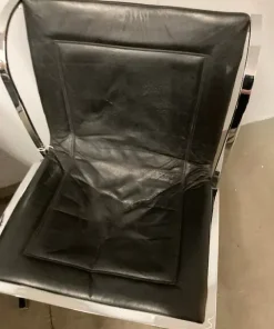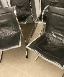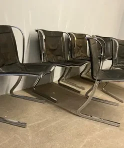 Gruppo di sedie in metallo cromato e seduta in cuoio . Design unico , anni 70 Milano , produzione Fumagalli. Alcune sedute sono state restaurate . Le cromature son state pulite. Pronte da inserire in ambiente.