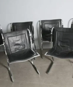 Gruppo di sedie in metallo cromato e seduta in cuoio . Design unico , anni 70 Milano , produzione Fumagalli. Alcune sedute sono state restaurate . Le cromature son state pulite. Pronte da inserire in ambiente.