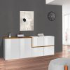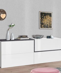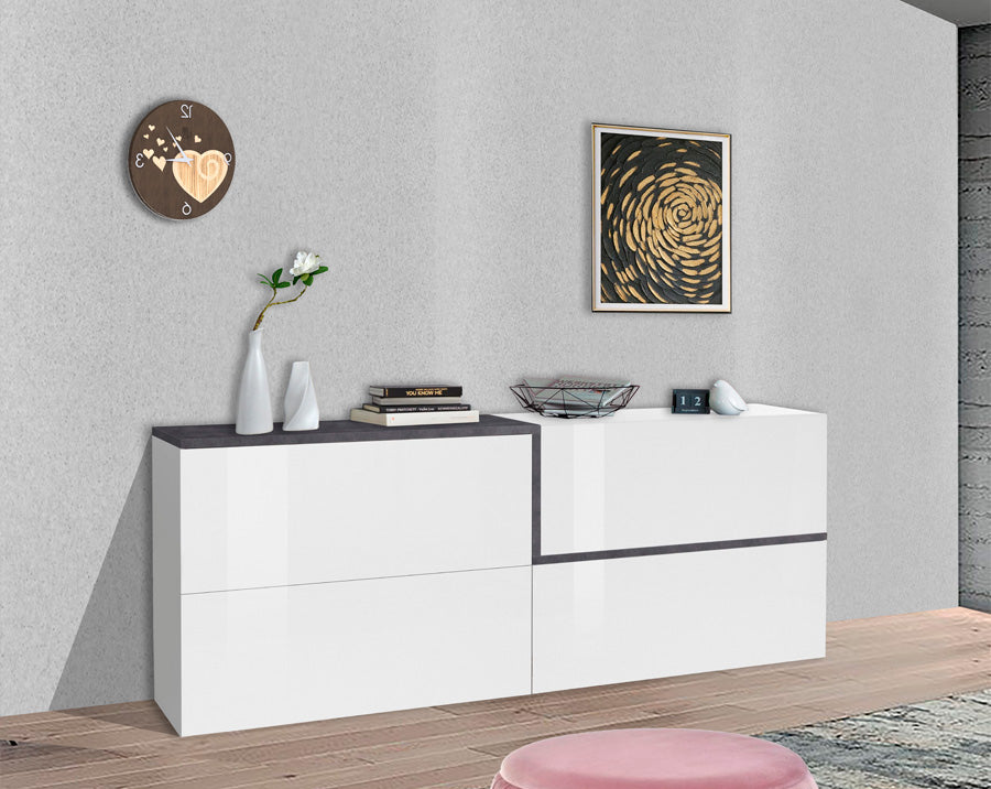 Mobile credenza in legno, stile moderno, colore bianco lucido. La struttura presenza un particolare bordino a Z a scelta tra il colore pero o ossido. Ottima per arredare il vostro soggiorno o salotto, il mobile offre un look giovanile e fresco, realizzato con soli materiali resistenti.