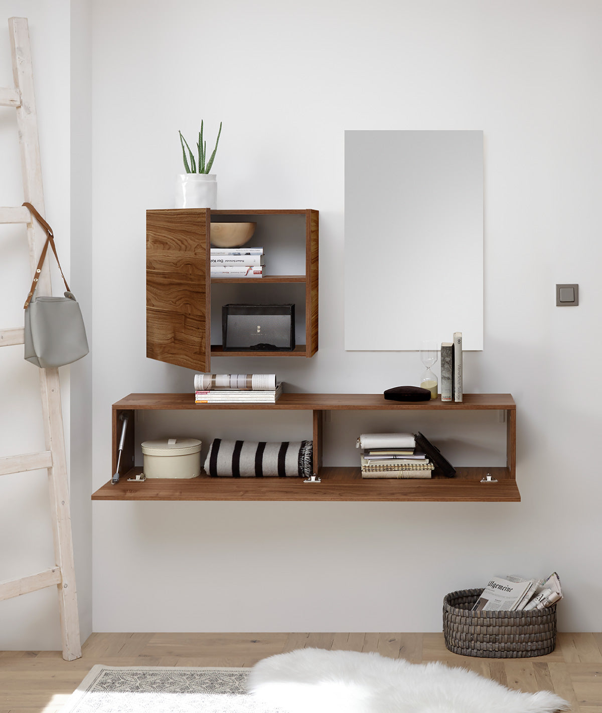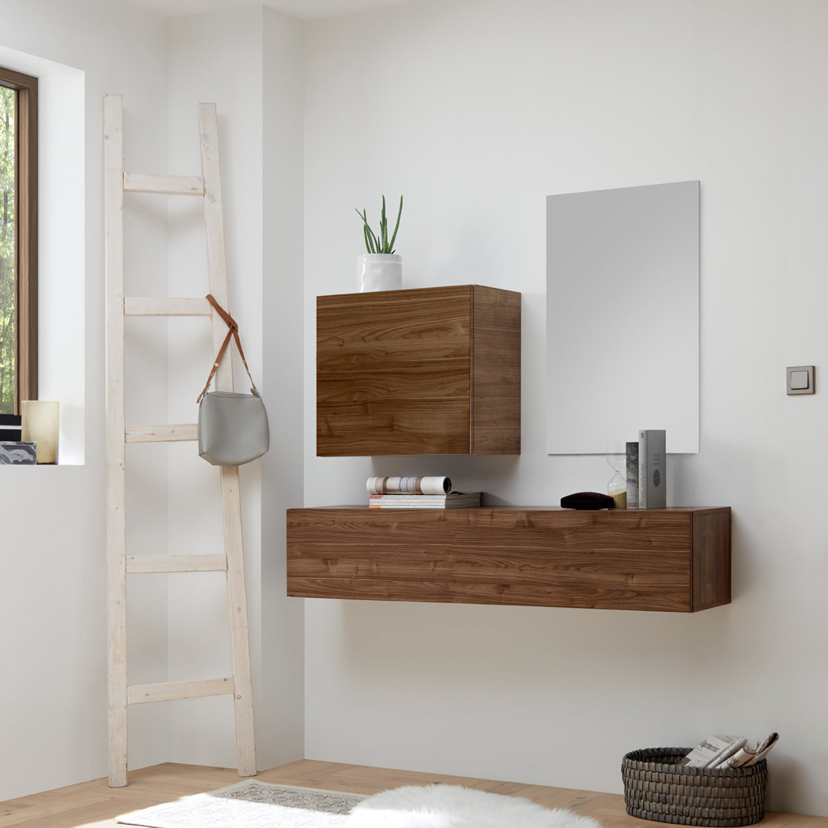 Composizione per ingresso Iker, con due pensili sospesi e uno specchio, caratterizzato dall’estrema essenzialità delle forme, con finiture del legno in diverse varianti di colore.