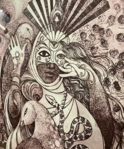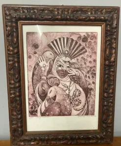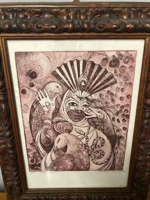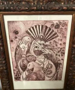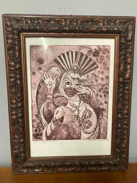 Incisione di donna in maschera con animali arte contemporanea del XX sec a firma Conchita . color amaranto mis 46 x cm 36 . Interno 36 x cm 26