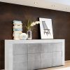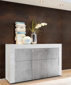 Credenza moderna Isabella con 3 ante, sobria e pratica, pensata per adattarsi nei contesti più svariati. Disponibile nei colori interamente bianco lucido oppure bianco e ante cemento.