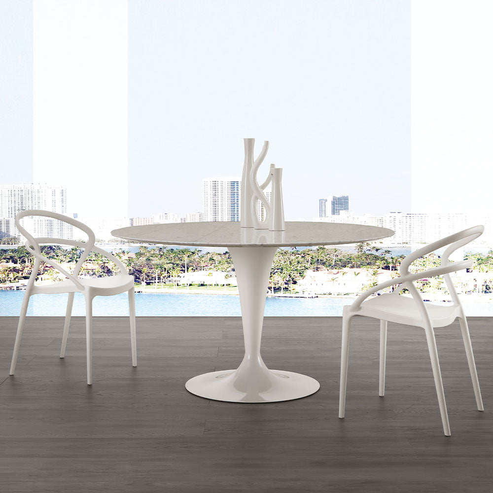 Estrema eleganza per questo tavolo design rotondo fisso, composto da solida base in acciaio verniciato bianco e piano in marmo di carrara.