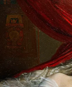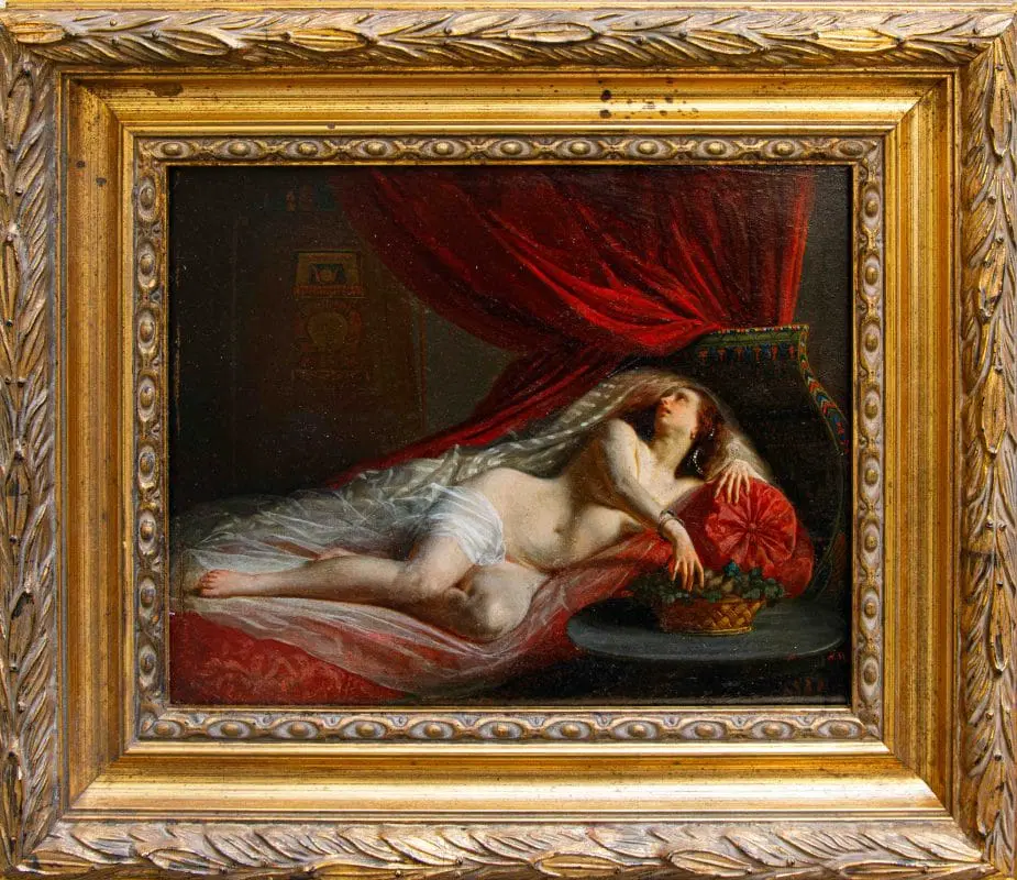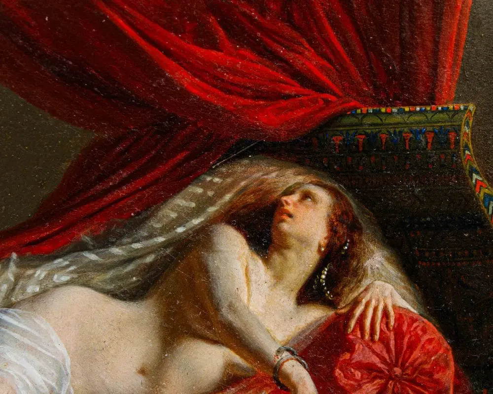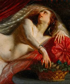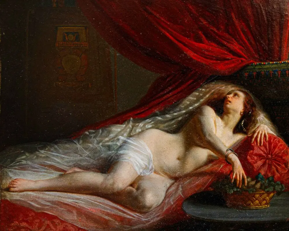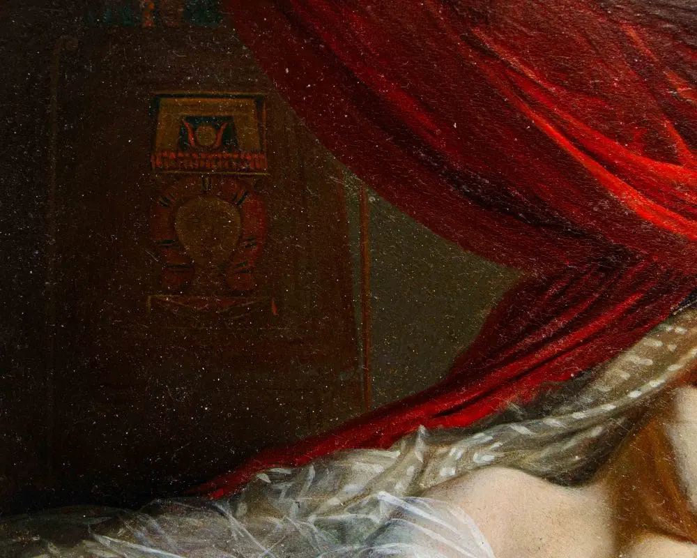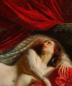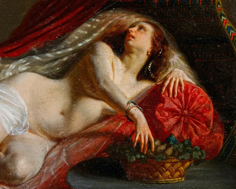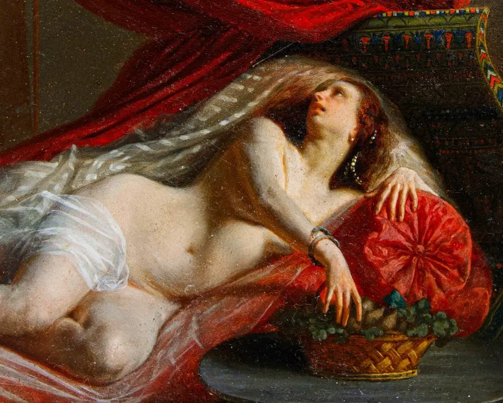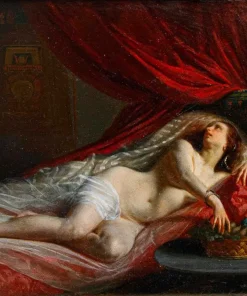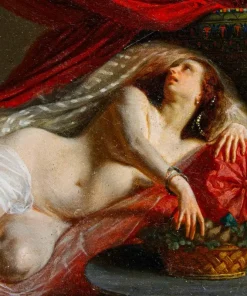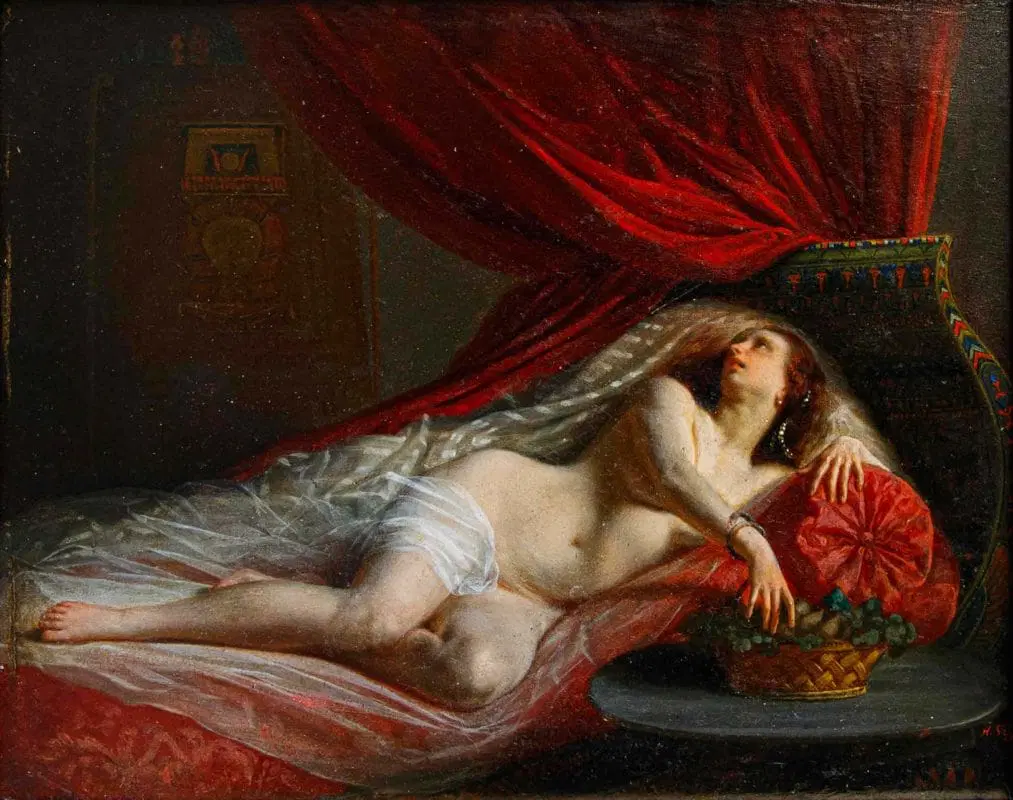 In questo dipinti, perfettamente in linea con la pittura dei grandi maestri francesi della metà dell’Ottocento, primo tra tutti Courbet, la regina egiziana è rappresentata nuda, in una posa estremamente sensuale, adagiata su un morbido triclinio rosso damascato. La pennellata agile e rapida così come la resa della lucentezza e della trasparenza dei tessuti mettono in evidenza la straordinaria perizia tecnica dell’artista, in grado di fornire massimo risalto all’intrigante figura femminile. I soggetti femminili di carattere mitologico si ripresentano con frequenza nell’intero corpus pittorico di Viger, così come testimoniato da Flora e Zefiro, dipinto commissionato da Napoleone III la cui ubicazione oggi risulta ignota (l’opera è attualmente nota unicamente tramite fotografie storiche).