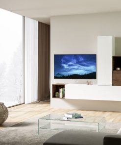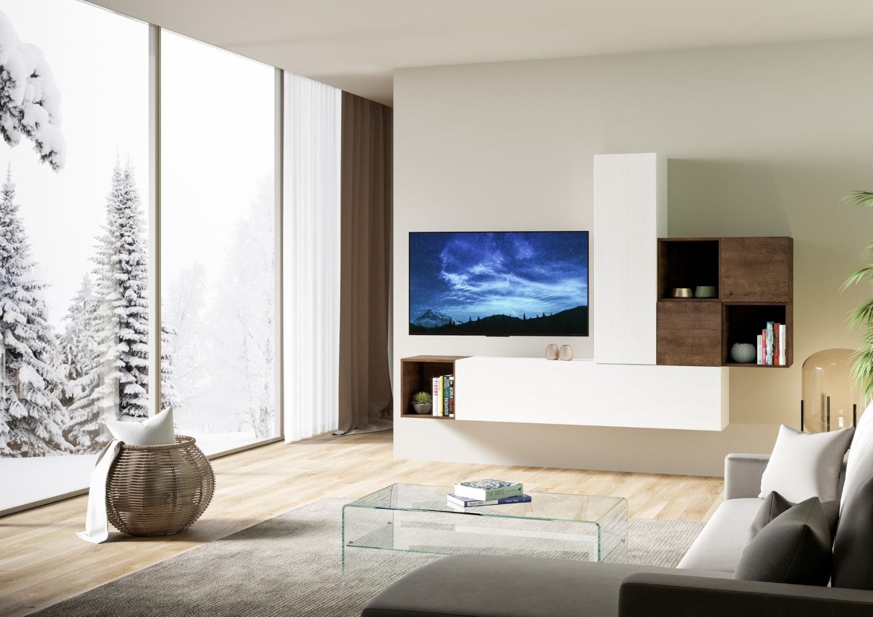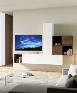 Parete da soggiorno Kassia, una soluzione sobria facilmente adattabile al tuo living moderno. Kassia è composta da pensili, cubi e vani realizzati in legno bianco e noce.