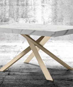 Formidabile tavolo allungabile modello Komel, proposto in questa versione con piano in legno effetto marmo, imperdibile per chi apprezza l’eleganza di questa affascinante finitura. Le caratteristiche gambe del tavolo moderno Komel sono realizzate in metallo colore visone.