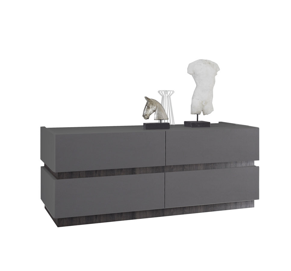Kometa è una particolare cassettiera a 4 cassetti che si sviluppa in lunghezza piuttosto che in altezza, realizzata in legno grigio opaco. Kometa potrà essere impiegata anche come mobile porta tv alto.