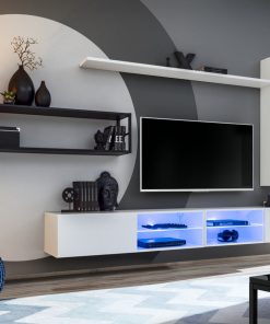 La parete da salotto Korad è costituita da 2 basi porta tv con luci a led che accompagnano i ripiani in vetro, un pensile verticale, mensola e uno scaffale in metallo che è l’elemento che connota questo affascinante modello.