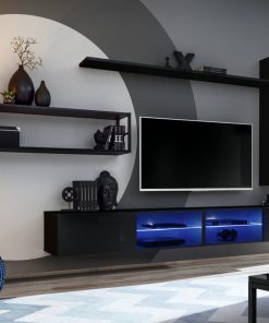 La parete da salotto Korad è costituita da 2 basi porta tv con luci a led che accompagnano i ripiani in vetro, un pensile verticale, mensola e uno scaffale in metallo che è l’elemento che connota questo affascinante modello.