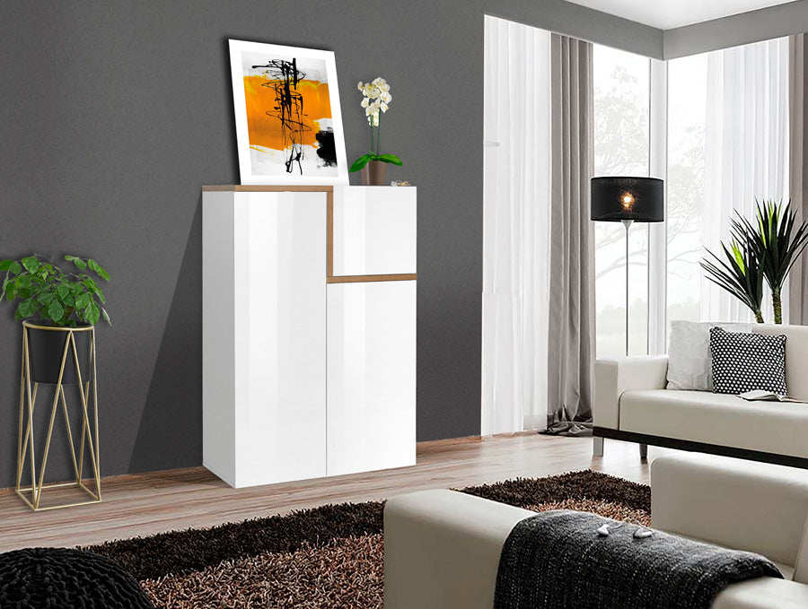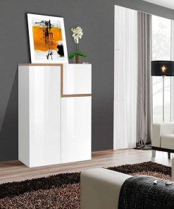 Eccezionale credenza alta da soggiorno o salotto, realizzata interamente in legno, colore bianco lucido. Particolare il bordino a forma di Z, che divide l’anta piccola dalle altre due più grandi, il quale è disponibile nella colorazione pero o ossido. Il mobile riflette lo stile moderno, perfetto per arredare la vostra casa con stile ed eleganza. Un prodotto Made in Italy, di qualità e resistente.