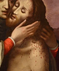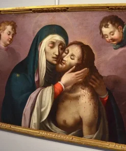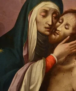 Nella tela qui proposta, il nostro autore ha saputo rendere il momento del compianto di Cristo in modo straordinario, dimostrando precisione, realismo e profondità emotiva nell’interpretazione della sacra unione tra la Madonna e il Cristo, attraverso un magistrale gioco di contrasti di colori e di luci ed ombre.