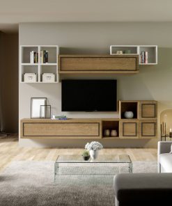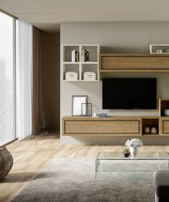 Parete moderna Laika Evo realizzata interamente in legno, un parete super attrezzata grazie ai suoi numerosi elementi. Infatti, Laika Evo include 2 pensili orizzontali e tanti vani e cubi alteranti in modo armonioso con un accostamento di finiture sobrio e versatile come bianco e quercia. I pensili e cubi si caratterizzano per la presenza di cornicette colore antracite che arricchiscono questa parete e la rendono esteticamente, ancora più piacevole.