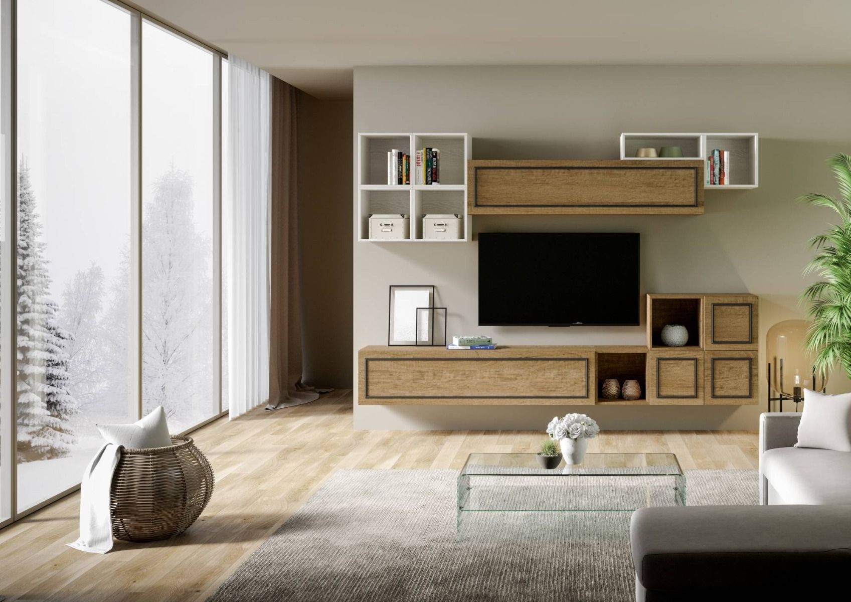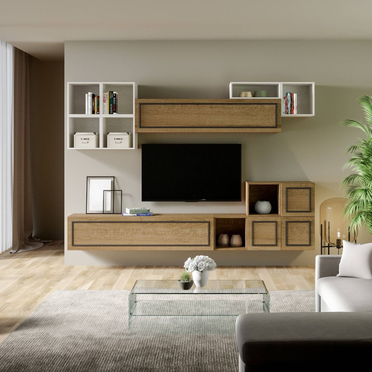 Parete attrezzata moderna Laika Evo, formata da pensili orizzontali, vani e cubi in legno bianco e quercia. Laika Evo comprende un dettaglio interessante che la caratterizza, ossia cornici in legno colore antracite sui frontali dei pensili e dei cubi. Laika Evo è un prodotto interamente italiano, disegnata e prodotta con maestria e cura nei dettagli.