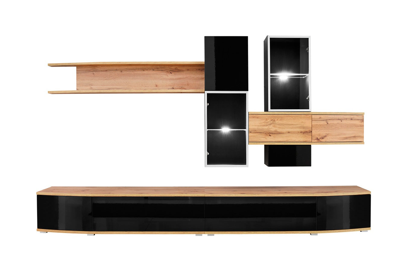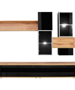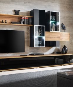 Laionis è una parete attrezzata perfettamente in linea con un arredamento moderno e innovativo, infatti, conquista per l’abbinamento di elementi in nero lucido e altri in quercia natura. Inoltre la presenza di ripiani in vetro con luci a led, creano un dettaglio ancora più intrigante.