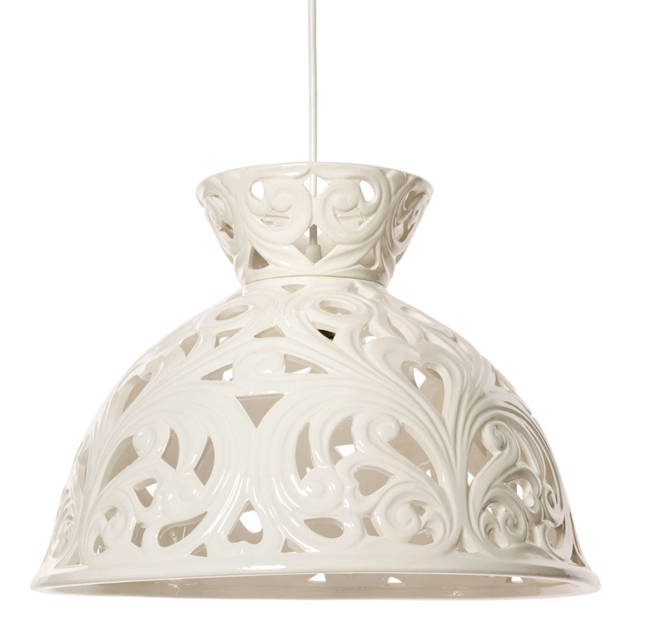 Sospensione traforata grande, realizzata in ceramica, di colore bianco. La trama traforata è disegnata da cuori e altre forme molto decorate, che danno eleganza alla stanza, grazie anche allo stile classico utilizzato nella realizzazione, che offre la possibilità di collocare il lampadario in qualsiasi tipo di ambiente.