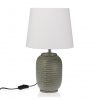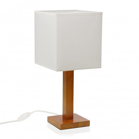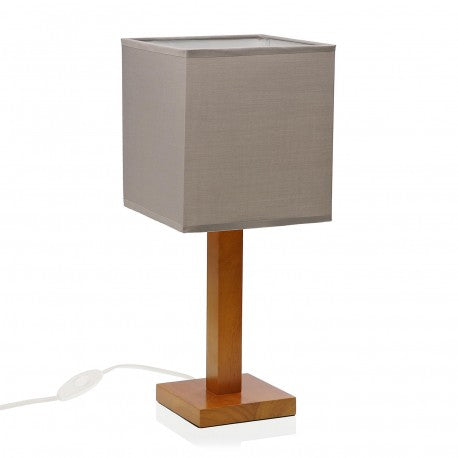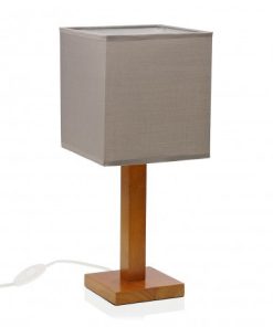Lampada da tavolo che assumono le forme di un modello caratterizzato dal legno naturale, opportunamente accompagnato da paralume in tessuto di colore grigio. Lampada disponibile di colore bianco.