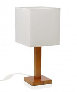 Lampada da tavolo realizzata in legno e tessuto. La lampada moderna si riveste con una base in legno con finitura naturale lucida e un paralume rivestito da una tessitura scura. La lampada è disponibile con paralume di colore bianco.