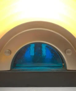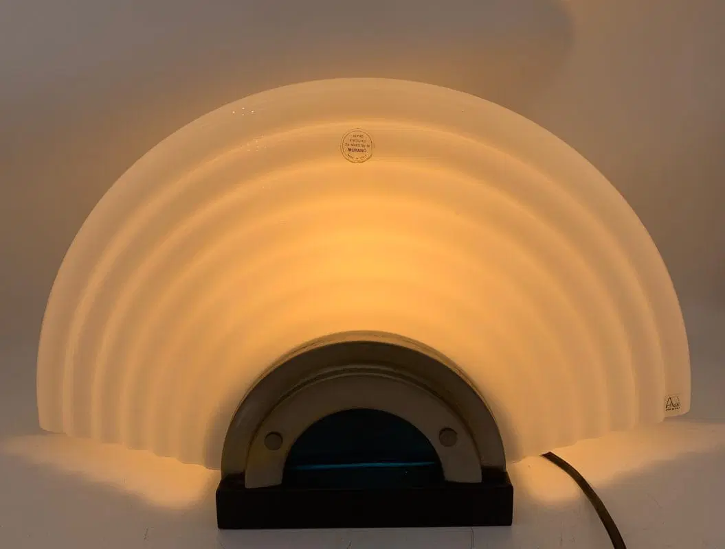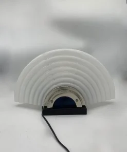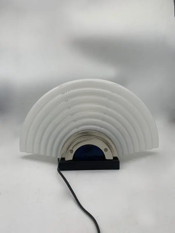 Questa lampada da tavolo presenta un design moderno anche se è degli anni 70 circa, con una combinazione elegante di materiali: cromo lucido e base in metallo e vetro di Murano. Il corpo della lampada è caratterizzato da un diffusore in vetro a forma di conchiglia color bianco opalizzato, e da un vetro sottostante color blu. La luce è all’interno della lampada con un portalampada e14.