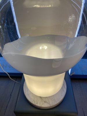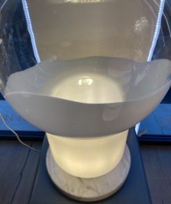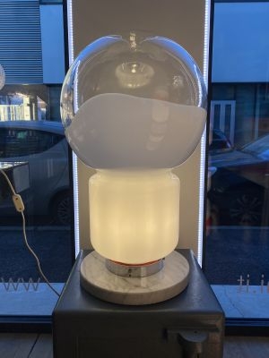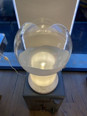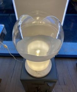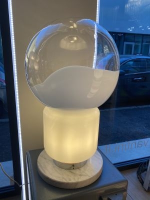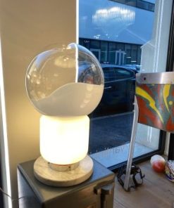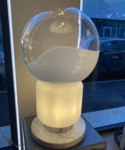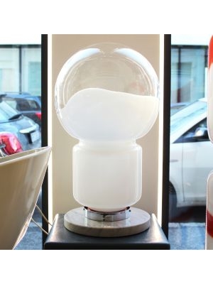 La base in marmo dona solidità e presenza, mentre il corpo superiore, dalla forma iconica a lampadina, è realizzato in vetro bianco con effetto colata, che crea un gioco visivo fluido e leggero, come se la luce stessa si fosse cristallizzata in una forma morbida e continua.