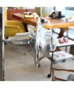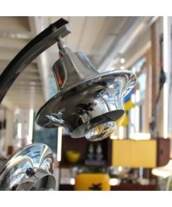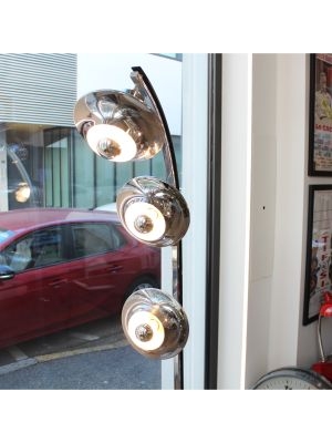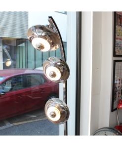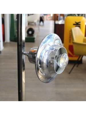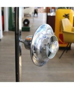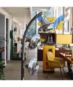 Le tre luci regolabili sono disposte in sequenza verticale, lungo lo stelo, e possono essere orientate per creare giochi di luce o per adattarsi a diverse esigenze funzionali. Ogni corpo illuminante riprende l’estetica futurista tipica dell’epoca, con volumi semplici ma d’impatto e finiture lucide.