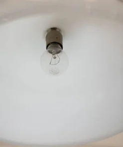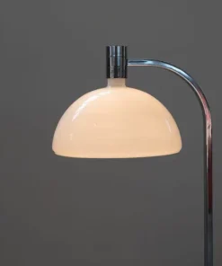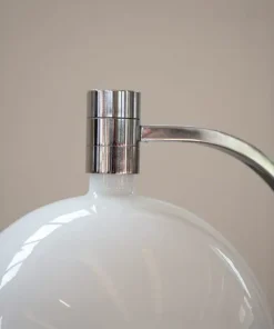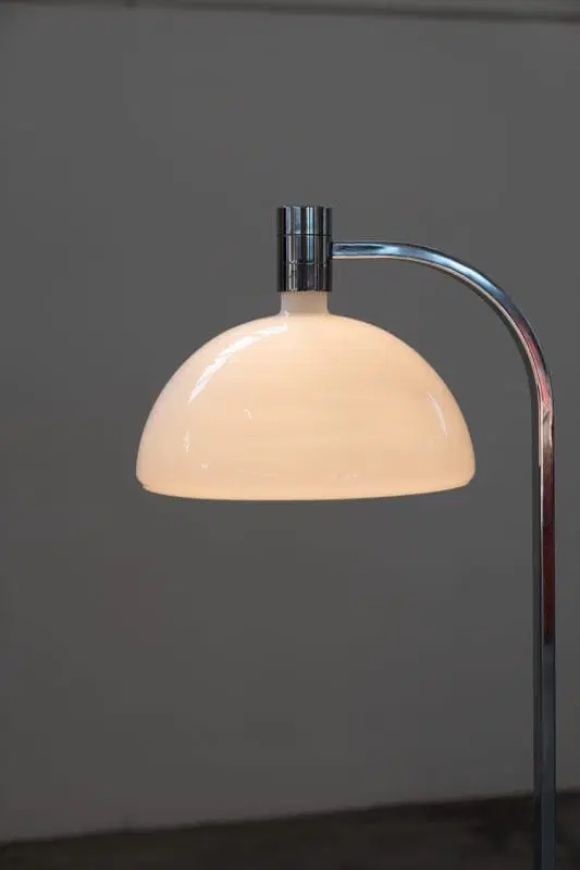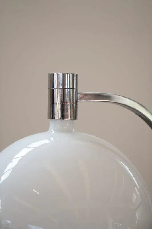 Lampada iconica e pezzo storico del design italiano, prodotto da Sirrah intorno il 1969. Vetro opalino e struttura in metallo cromato.