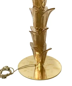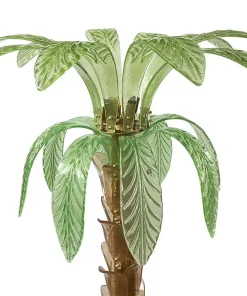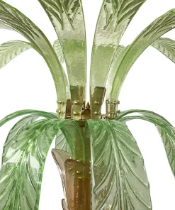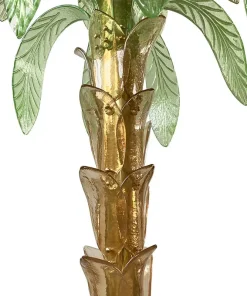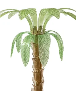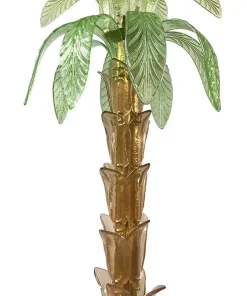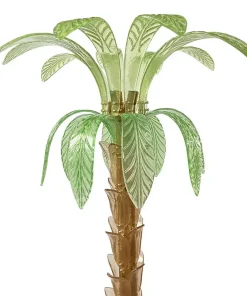 La lampada da terra che riproduce con pezzi di vetro il tronco e le foglie di una palma è composta da una base circolare e da uno stelo in ottone su cui sono state fissate trentasei piccole foglie in vetro di Murano color ambra; nella parte superiore, invece, sono state inserite venti grandi foglie in vetro verde di Murano, dieci sotto e dieci sopra. Al centro del secondo ordine di foglie ci sono quattro porta lampade orientabili per lampadine E14.
