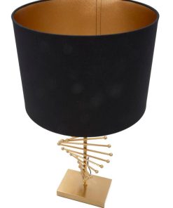 Lampada design da salotto, composta da base rettangolare e asta in metallo colore oro, arricchita da asticelle orizzontali. La particolarità di questa lampada da tavolo non è solo nella base ma anche nel paralume cilindrico in tessuto nero con interno colore oro.