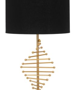 Fantastica lampada moderna utile per arricchire il salotto o camera a letto, facente parte di una serie di lampade da tavolo e da terra, caratterizzate dalla presenza del metallo dorato che compone la base e paralume in tessuto nero.