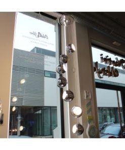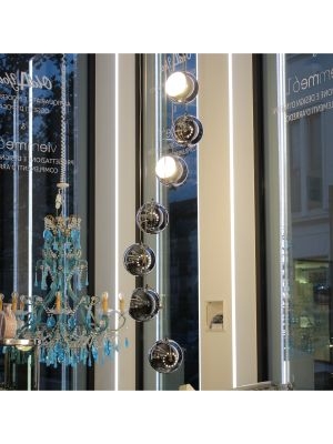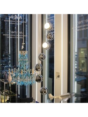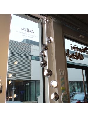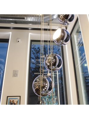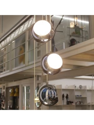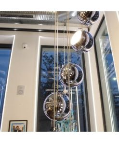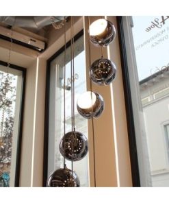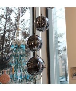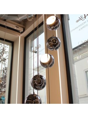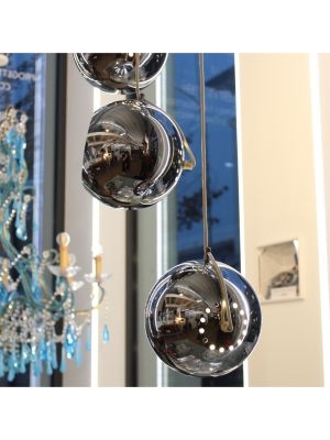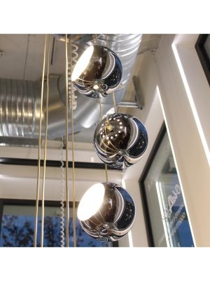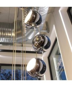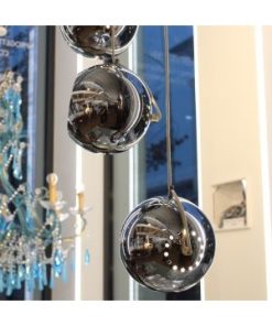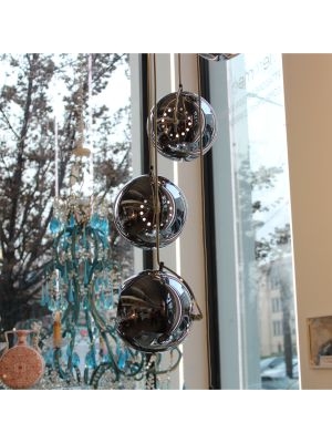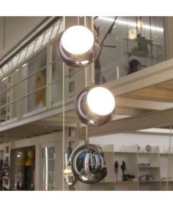 Le sue sfere cromate, disposte in sequenza verticale, creano un affascinante gioco di riflessi e profondità, evocando l’estetica futurista tipica dell’epoca. L’effetto è quello di una pioggia luminosa sospesa nel tempo, capace di trasformare l’ambiente con la sola forza della forma.