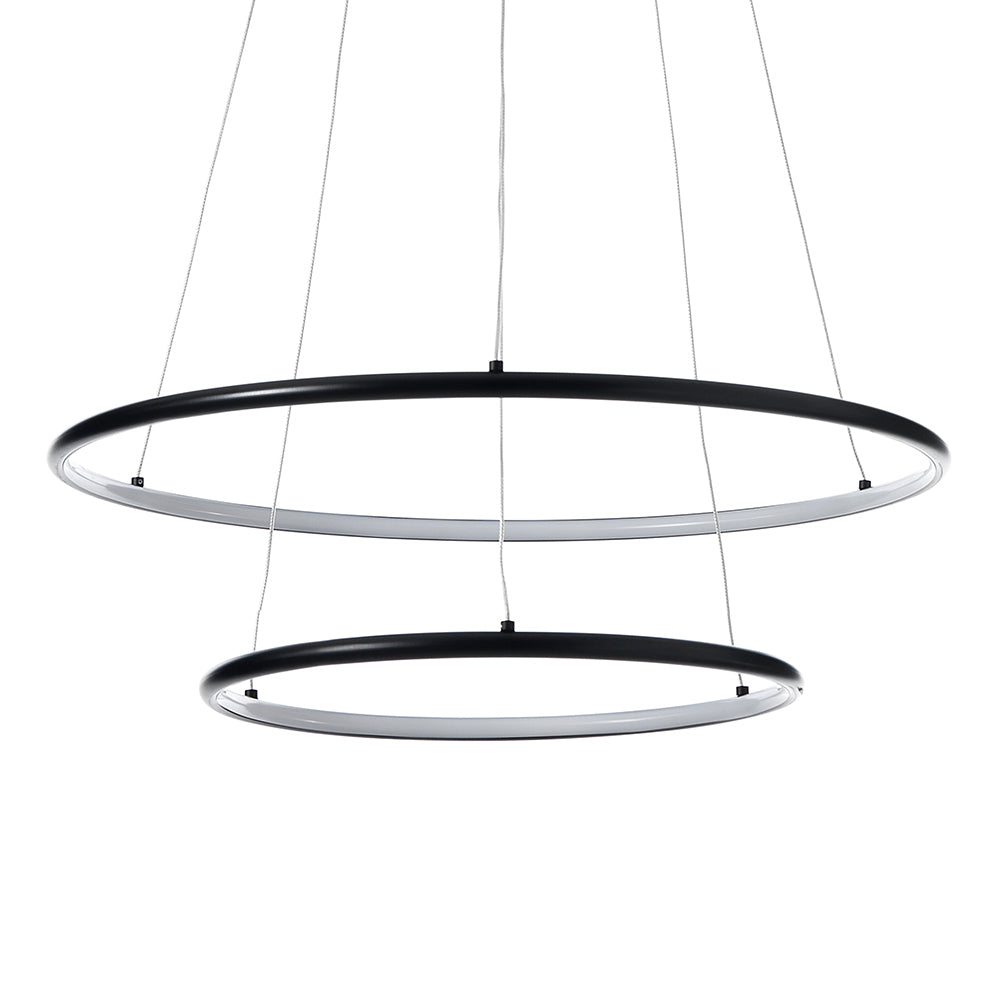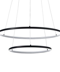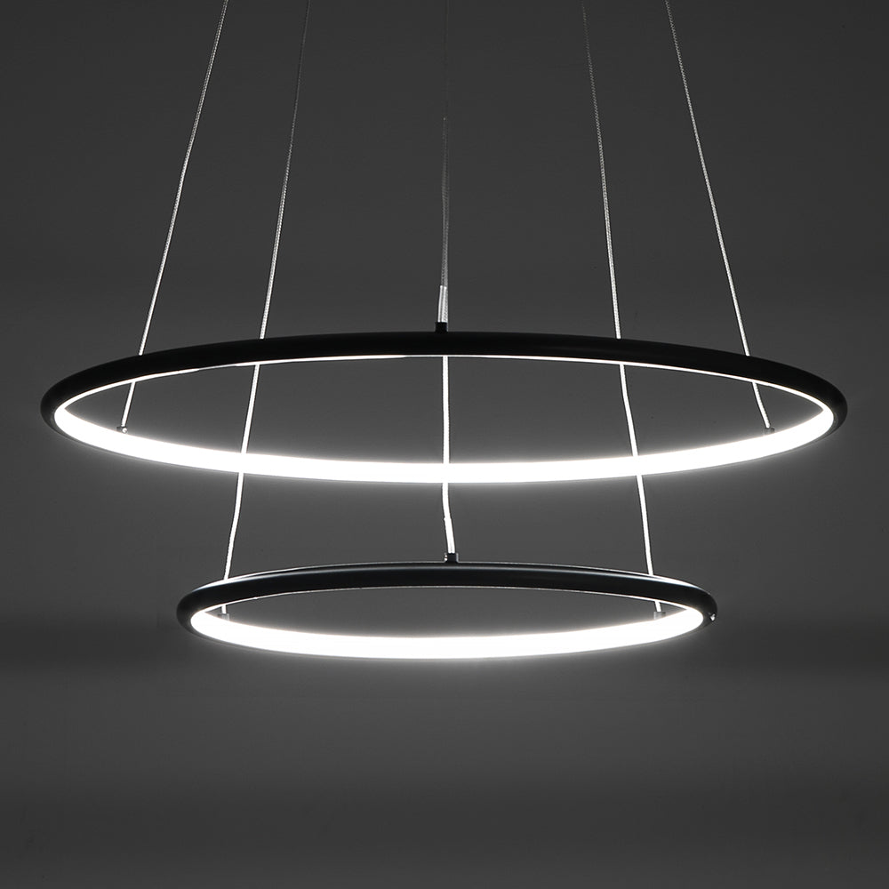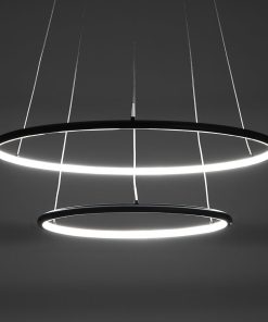 L’essenzialità del design è il tratto distintivo nonché l’originalità di questo lampadario a sospensione moderno, formato solamente da 2 anelli di dimensioni diverse in alluminio nero con led circolare.
