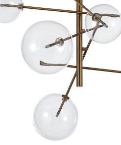Lampadario design a sospensione, caratterizzato da una struttura con tubolari in metallo colore ottone anticato con sfere in vetro di due dimensioni diverse.