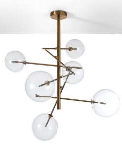 Eccezionale lampadario a sospensione, un modello originale, amabile per tutti coloro che apprezzano l’arredamento contemporaneo. La particolare struttura di questo lampadario moderno si fonda su sottili tubolari in metallo verniciato in ottone anticato che terminano con una sfera in vetro, contente luci a led, direzionate in maniera diversa in modo da illuminare l’intera stanza.