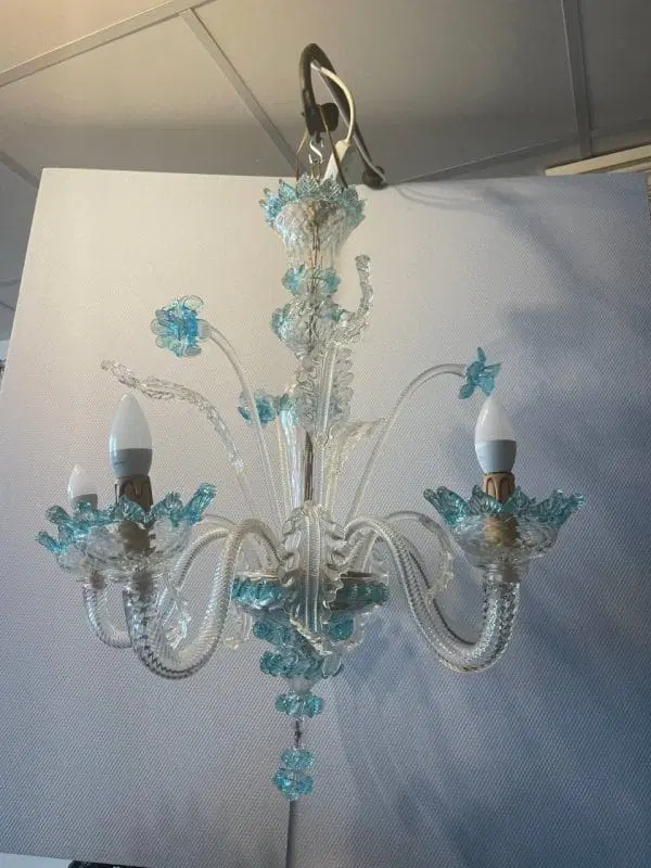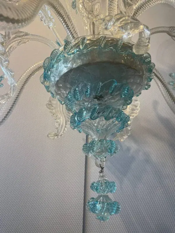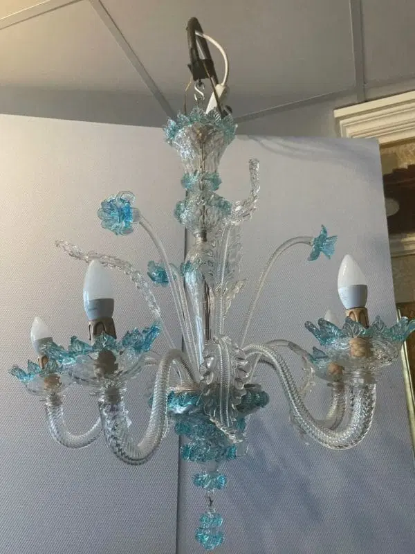 Bellissimo lampadario di Murano, trasparente con rifiniture azzurre di pregio, epoca seconda metà del 1900. Lavorazione artigianale, pezzo di rara bellezza e unico nel suo genere. Medie dimensioni. In perfette condizioni, completo in ogni sua parte. Funzionante, voltaggio 220. Altezza cm 78, ingombro massimo cm 70. Imballaggio professionale, spedizione solo smontato, si allegano istruzioni di montaggio. Consigliato ritiro in sede ove possibile.