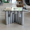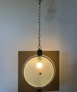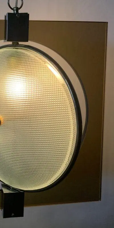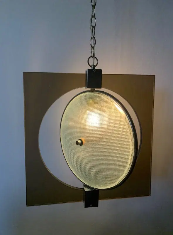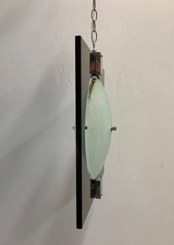 Fantastico e raro lampadario degli anni 1970 circa in discrete condizioni attribuito alla ditta F. Arte E’ tutto originale, ha pochissimi segno del tempo, vetri fantastici color fumè, e vetro centrale trasparente. impianto elettrico rifatto e funzionante.