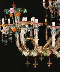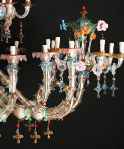 Lampadario in vetro di Murano, modello a barca, stile Rezzonico, soffiato e lavorato a mano con tecnica antica. Su ogni braccio in metallo cromato sono infilati i vetri che compongono il lampadario. Questo modello viene realizzato con decori dorati e bianchi e con i fiori in vetro in pasta nelle tonalità giallo azzurro verde e rosa.