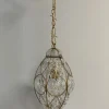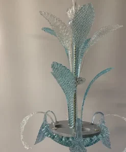 Lampadario in vetro di Murano realizzato interamente a mano, caratterizzato da una composizione a due livelli con struttura centrale in vetro soffiato trasparente e acquamare, da cui si sviluppano eleganti elementi decorativi a forma di foglie ricurve e lavorate a rilievo, con una texture rigata tipica della tecnica “rigadin”, i motivi fogliari si dispongono armoniosamente verso l’alto e verso il basso creando un effetto visivo leggero e sofisticato, sospeso tramite una catena metallica, il lampadario richiama lo stile classico veneziano con richiami organici e marini, evocando l’immagine di una medusa stilizzata in chiave artistica.Impianto elettrico nuovo con 3 portalampade e 27.