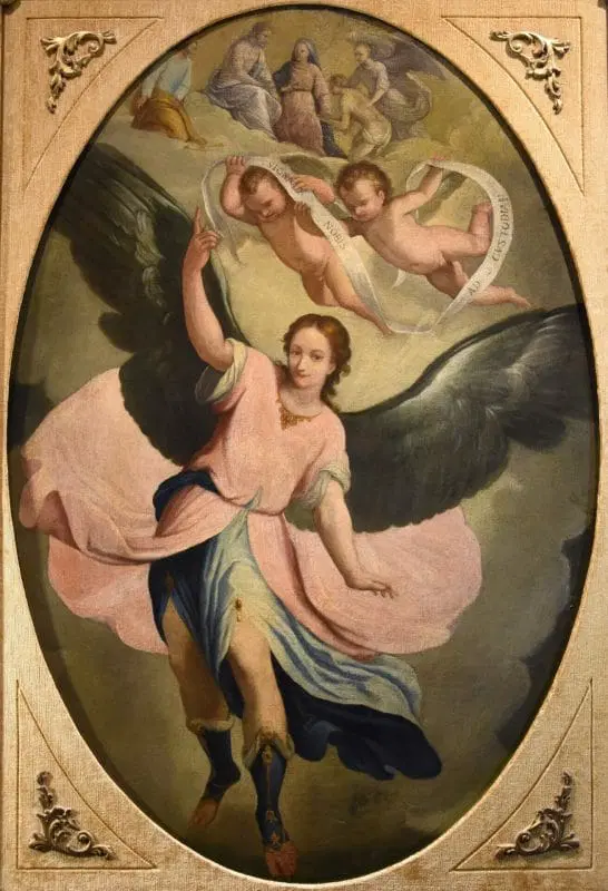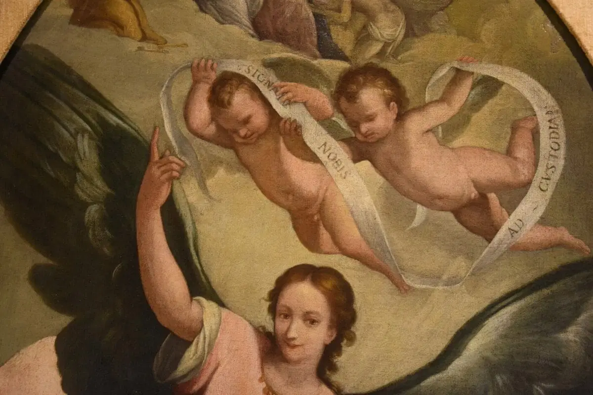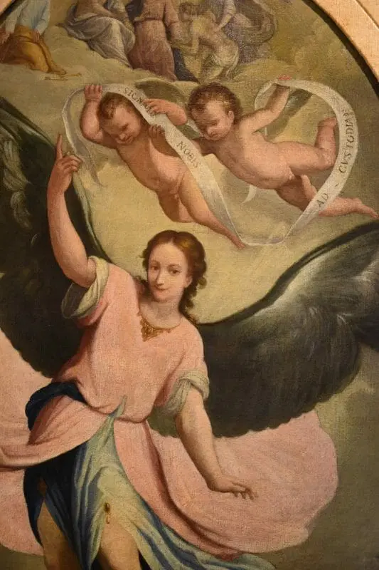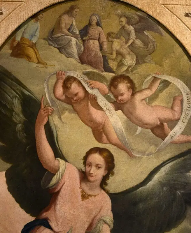 L’angelo è immortalato mentre indica simbolicamente verso l’alto con la mano e porta in sé il significato di protettore e in particolare è qui ritratto come l’emblema dell’Angelo Custode. Due angeli lo sorvolano postando il cartiglio con l’iscrizione ‘SIGNATVS NOBIS AD.CVSTODIAM’, che si riferisce appunto alle preghiere verso Dio affinché ci assegni un custode che provveda alla nostra guardia.