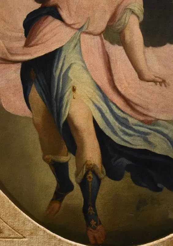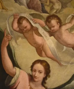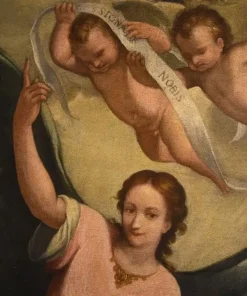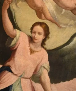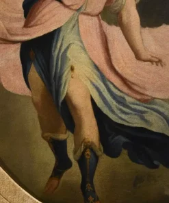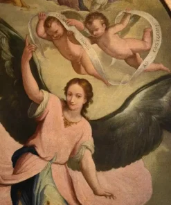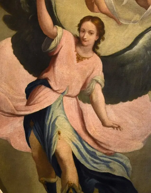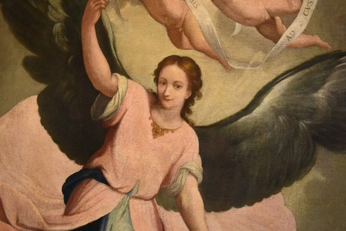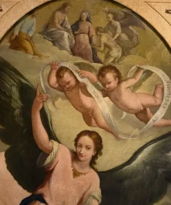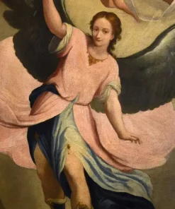 Porta con se un grande fascino questa preziosa tela, che ha per soggetto l’Arcangelo Raffaele in gloria, uno degli Angeli che stanno al cospetto di Dio cantandone le lodi, qui raffigurato come un giovinetto dall’etera bellezza che si staglia in volo grazie alle grandi ali spiegate.