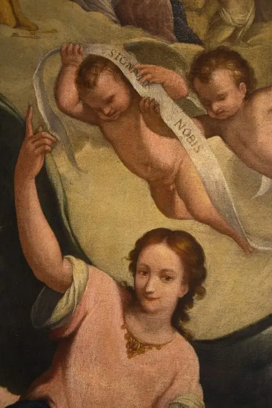 La figura dell’angelo colpisce per la sua luminosità, bellezza e perfezione, insieme all’esplicita gestualità delle sue mani atte a indicare la parte alta della composizione, dove si può vedere la figura del protetto, presumibilmente collegato al committente, inginocchiato al cospetto di Gesù, della Vergine e di San Pietro, protettore della città.
