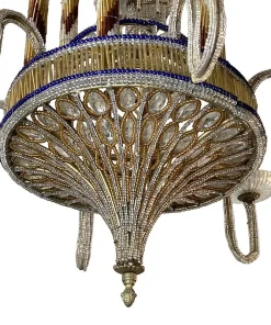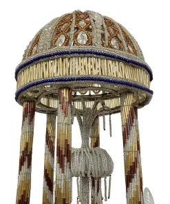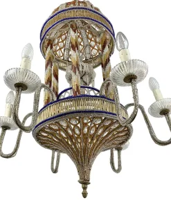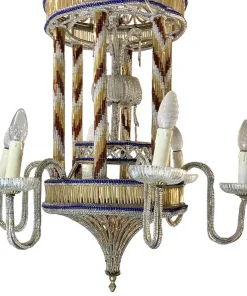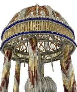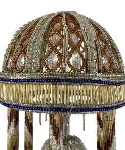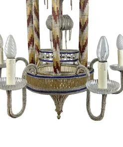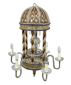 Struttura a forma di padiglione composta da montanti metallici con bracci a forma di S che si estendono dalla balaustra e terminano con grondaie in vetro scanalato. Al centro del padiglione una fontana. Questo e tutti gli altri elementi sono decorati con perle di vetro di varie forme e in quattro colori diversi. 6 lampadine E14.
