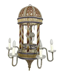 Struttura a forma di padiglione composta da montanti metallici con bracci a forma di S che si estendono dalla balaustra e terminano con grondaie in vetro scanalato. Al centro del padiglione una fontana. Questo e tutti gli altri elementi sono decorati con perle di vetro di varie forme e in quattro colori diversi. 6 lampadine E14.