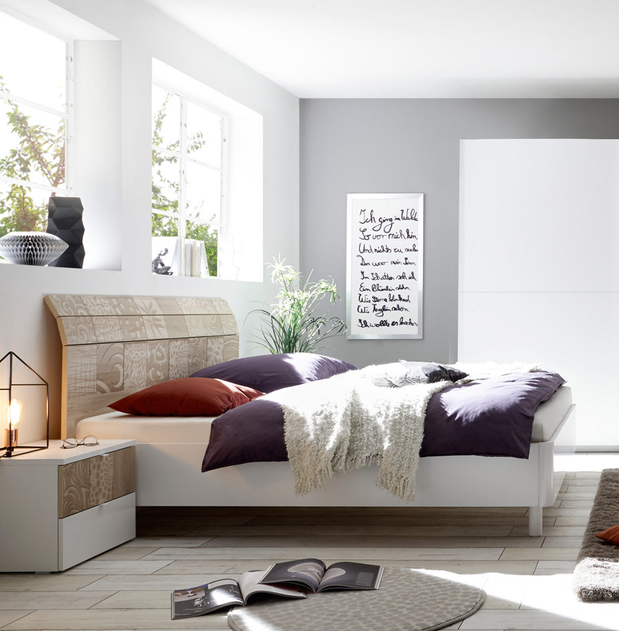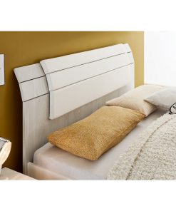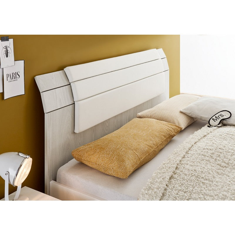 Letto moderno matrimoniale Leatre da cm 160 prodotto in legno bianco e definito da una particolare testiera con doghe decorata con serigrafie, disegni che producono un aspetto elegante e chic. La finitura rovere samoa della testata è indicata per chi ama il colore naturale del legno, inoltre potrai aggiungere un cuscino in ecopelle bianco per creare un comodo appoggio mentre si legge un buon libro.