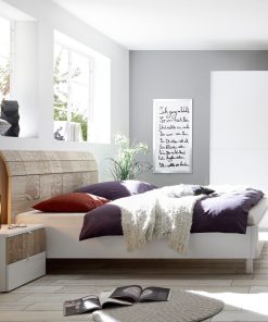 Per chi ama il delicato colore rovere, il nostro negozio on line propone questa fantastica linea di mobili da camera basata sul binomio bianco e rovere. Il letto matrimoniale Leatre rientra in questa collezione e si caratterizza per la testiera composta da doghe orizzontali realizzate in rovere e arricchita da deliziose serigrafie, mentre il giroletto è prodotto in bianco opaco. Con il letto matrimoniale Leatre potrai realizzare una camera moderna e raffinata, soprattutto se abbinato con l’armadio e i comodini della linea.