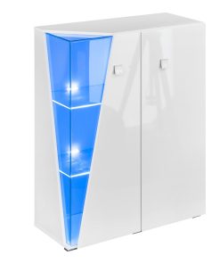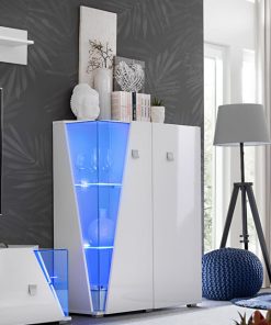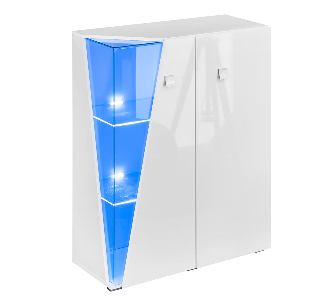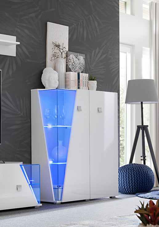 Fantasiosa vetrina con due ante, facente parte di una singolare linea di mobili da soggiorno progettati per coloro che amano arredare fuori dai soliti schemi, puntando su un design innovativo. La madia Leda, infatti, presenta un angolo in vetro che si apre come uno scorcio, sulla sua struttura semplice e lineare realizzata in legno colore bianco lucido. Questa apertura di forma triangolare, è vetrata, e lascia intravedere gli oggetti esposti illuminati da una particolare luce a led blu.