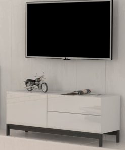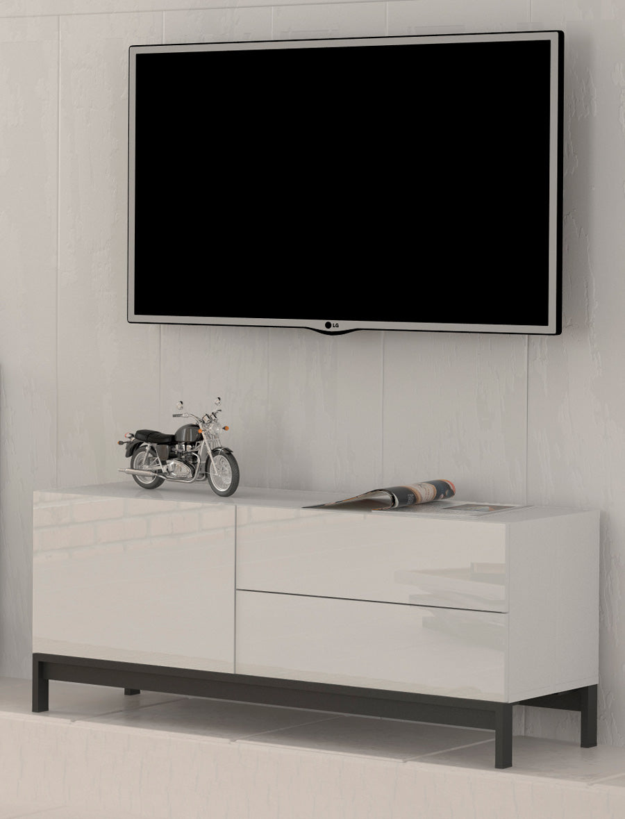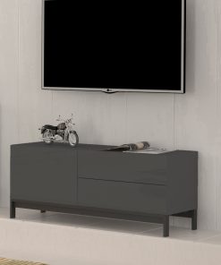 Mobile tv in legno, a scelta tra la colorazione bianco lucido o antracite. La struttura, dotata di anta e 2 cassetti, poggia su 4 piedini di colore nero. Perfetta da posizionare in soggiorno o salotto, il mobile conferisce un design moderno alla stanza. Un prodotto Made in Italy, di qualità e bellezza assicurata.