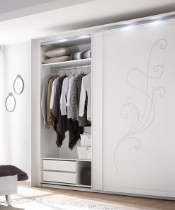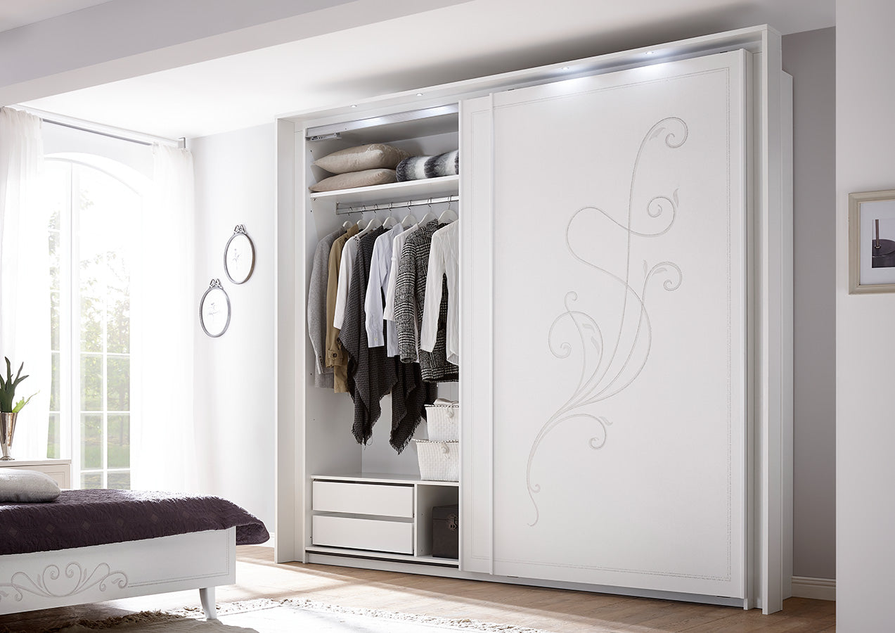 Incantevole armadio moderno con 2 ante scorrevoli Libel, un elemento prezioso per chi vuole arredare la propria camera da letto in stile elegante e classicheggiante. Libel è realizzato in legno bianco abbellito da una bellissima decorazione serigrafata con glitter che interessa tutto il frontale. Diversi sono l’optional che potrai aggiungere, come il passepartout per illuminarlo o la cassettiera interna.