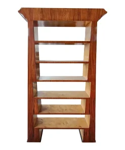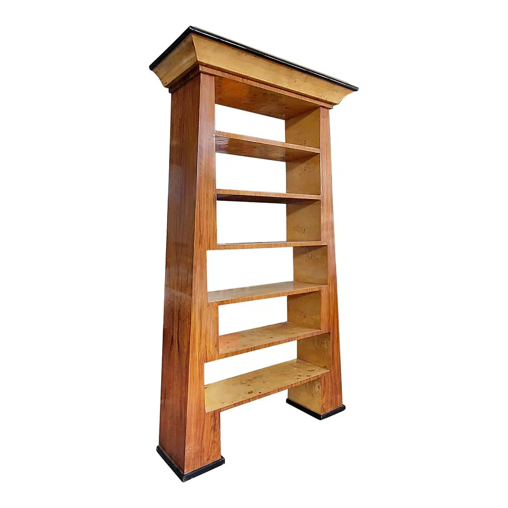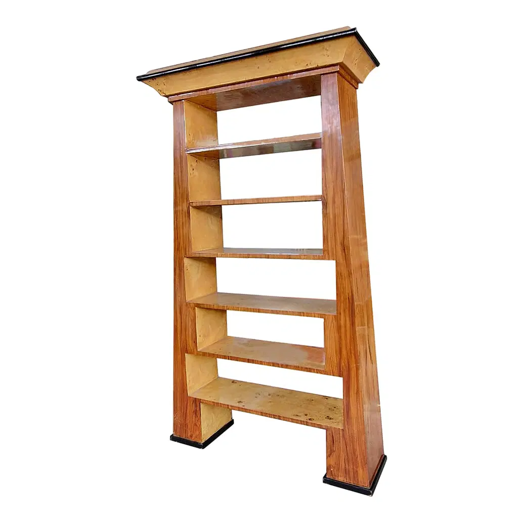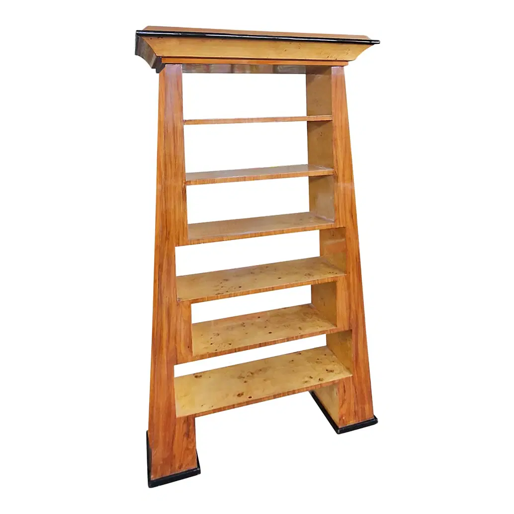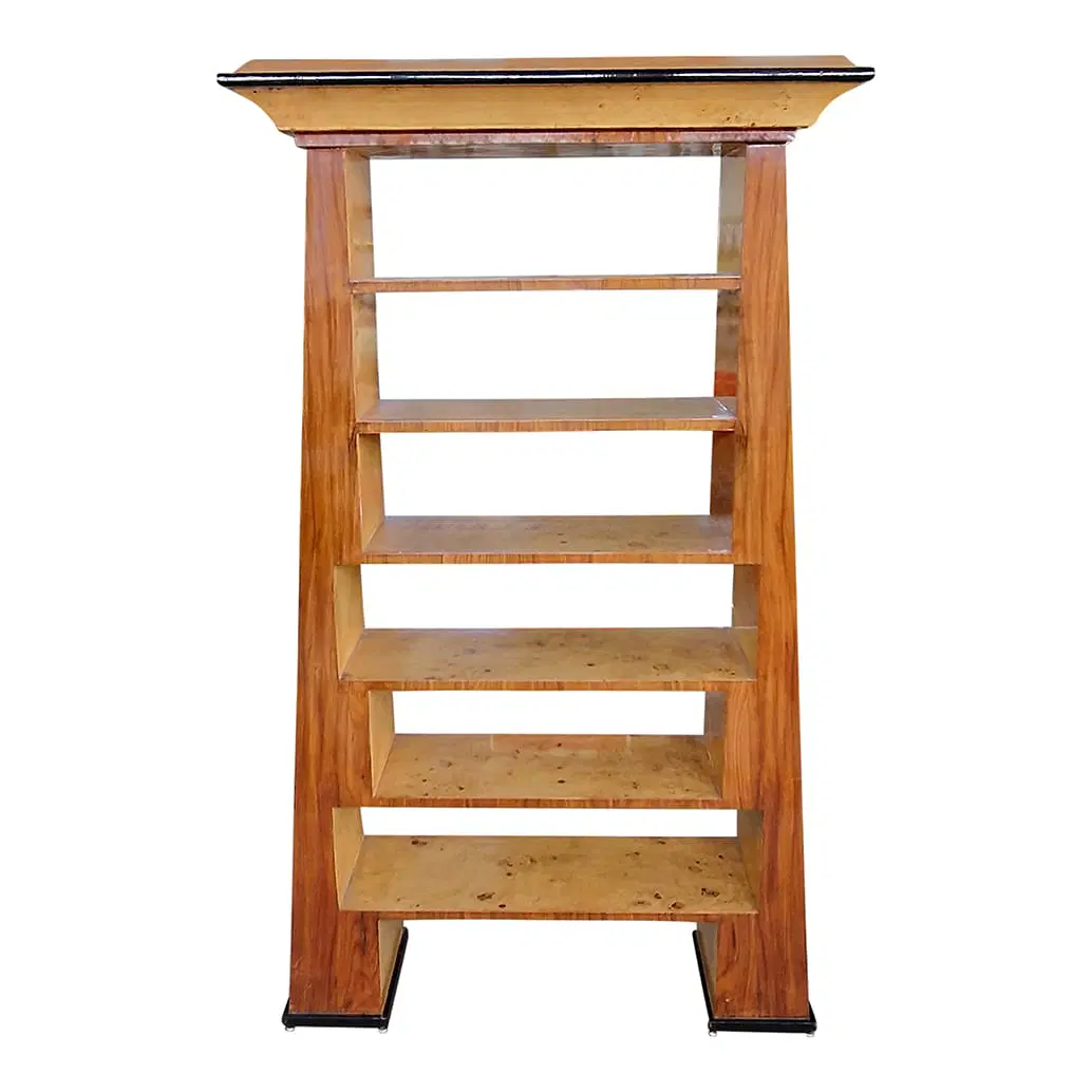 Libreria a trapezio in mogano e radica di betulla. Finiture laccate nere. Sei ripiani .
