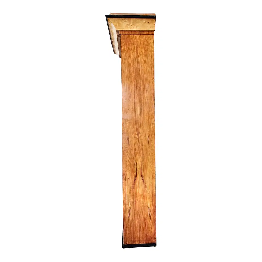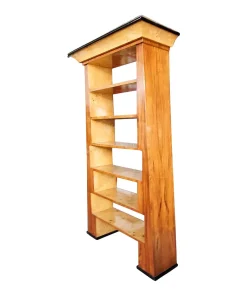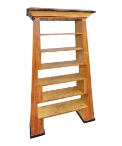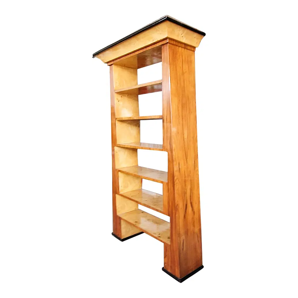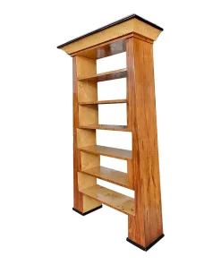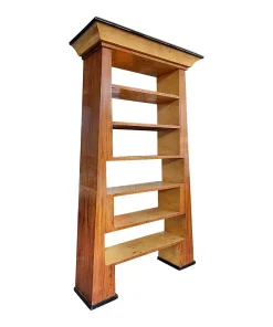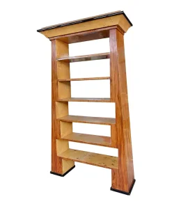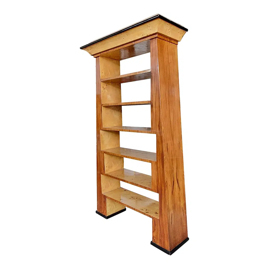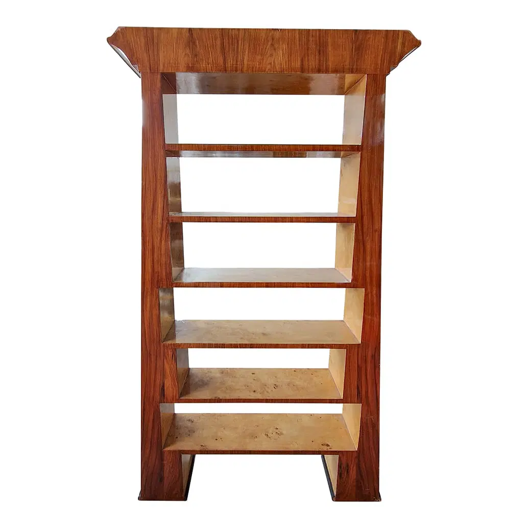 Libreria a trapezio in mogano e radica di betulla. Finiture laccate nere. Sei ripiani .